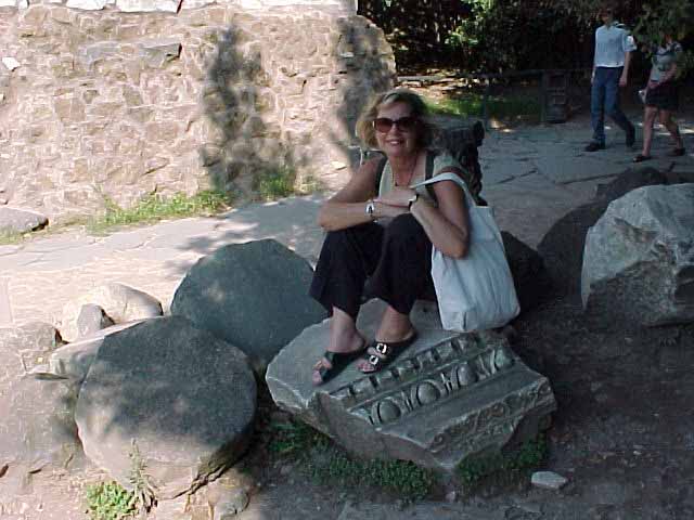 The remains of the huge buildings are scattered all over. Broken columns, and monuments. One building had 50 rooms! Another was built in 179 BC! And there are still some impressive remains and some beautiful mosaic floors to be seen. Here Jaunita sits, near the main route through the Forum. You can almost imagine the sound of chariot wheels on stone! |