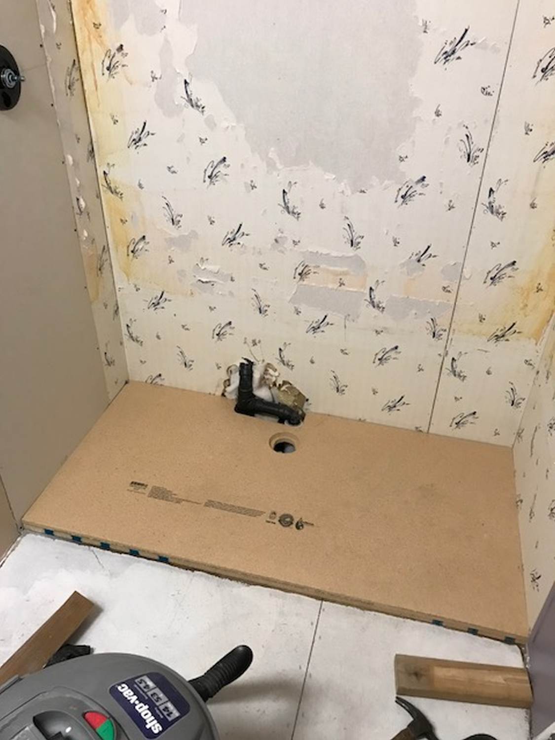 We are going to pick this up after I have already torn out the old fiberglass tub/shower surround. First, we put two layers of particle board down for a solid base. We did NOT want to move any plumbing, so the hole is bored where the existing drain already was. |