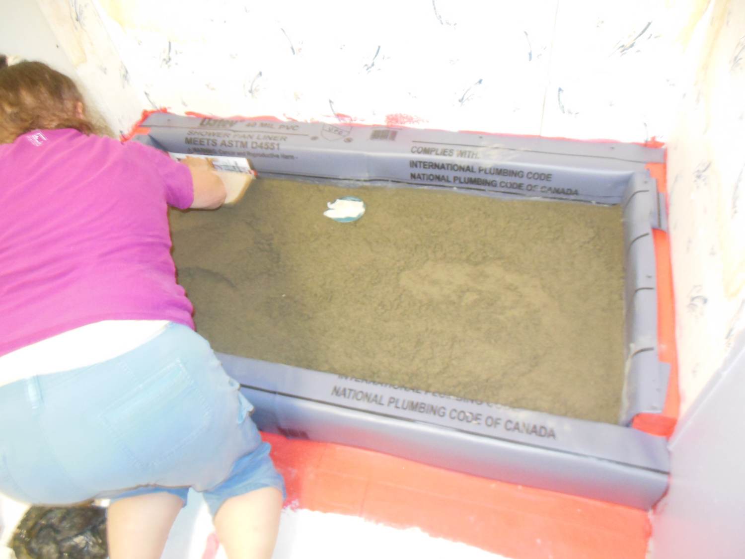 Floating the shower pan. This is a "dry mix" mortar. We got the recipe from YouTube.