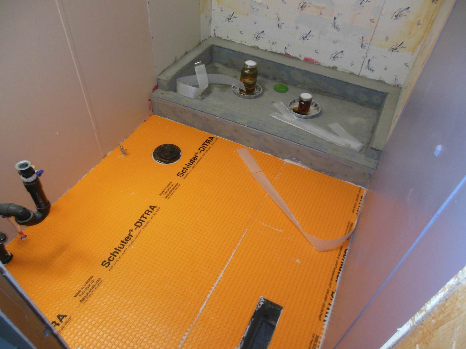 On to the main floor. It won't work in the shower, but for normal floors, Schluter Ditra is the way to go! It "de-couples" the tile from the subfloor so you won't get cracks in the tile or grout. Note, I am already using the shower... to ferment some chilis. |