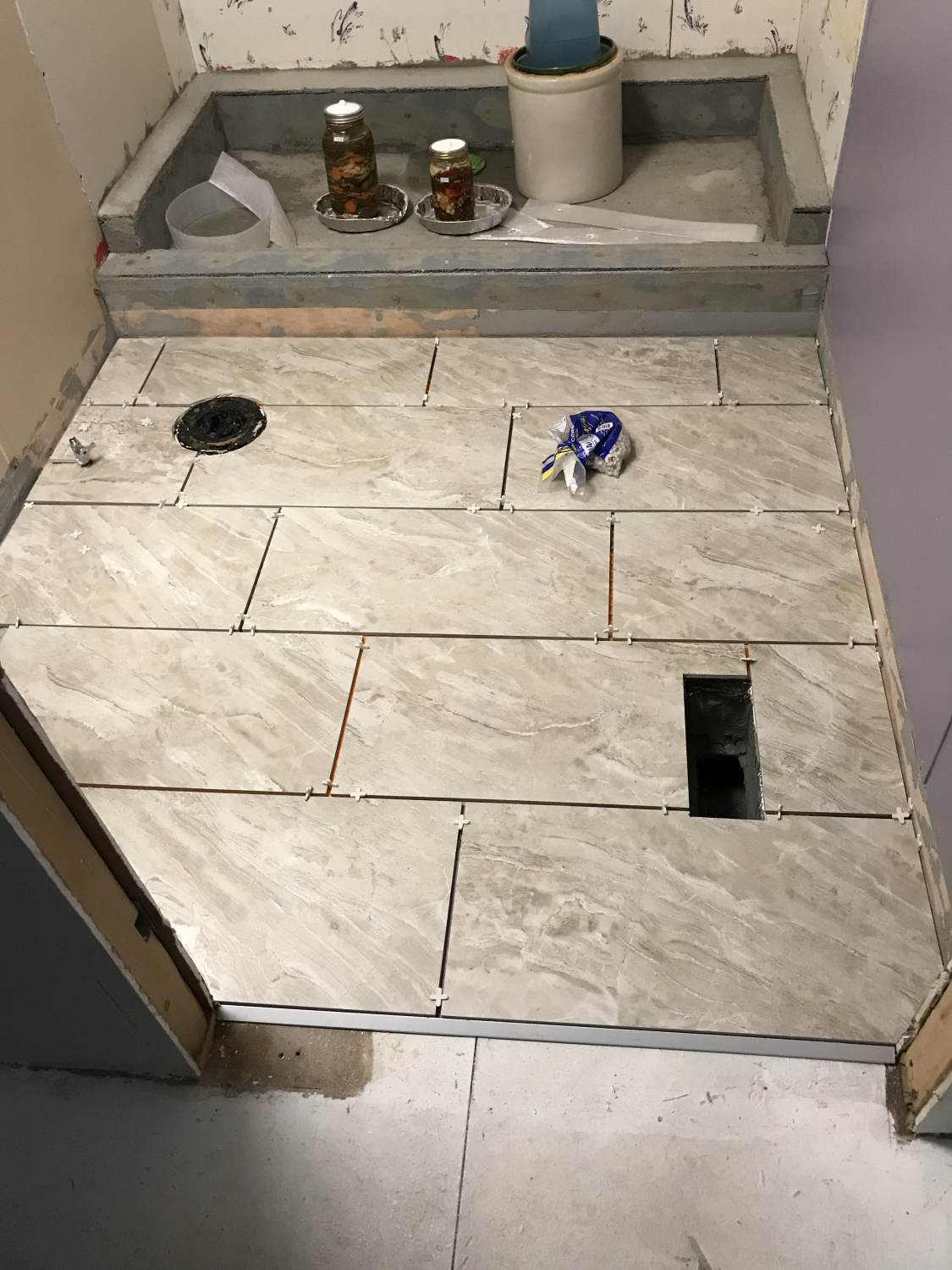 Tiles are cut and layed out with spacers. Ready to mix mortar and put them in place. The metal transition strip lines up just right. Also, more fermentation going on in the shower!