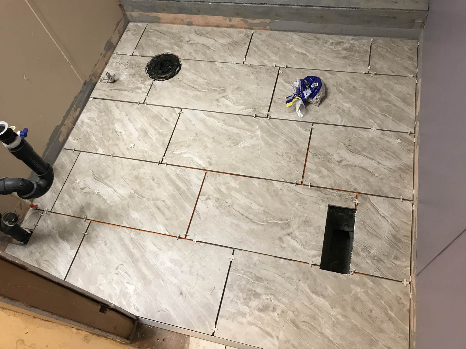 Tiles are cut and layed out with spacers. Ready to mix mortar and put them in place. The metal transition strip lines up just right.