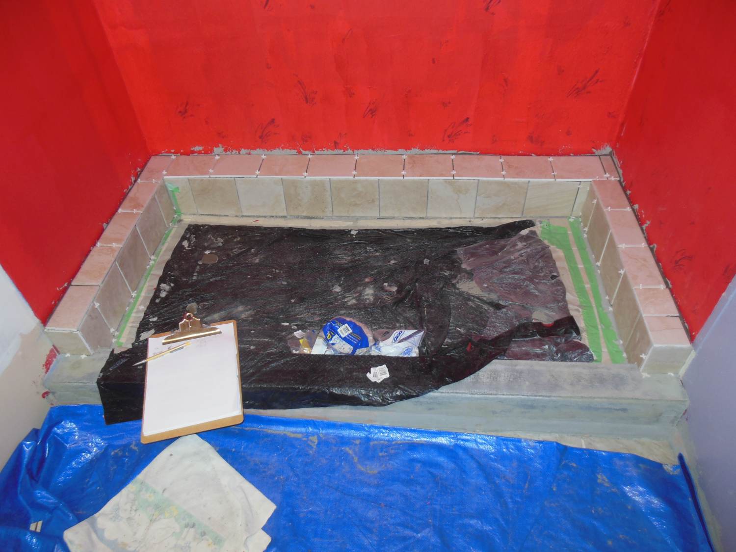 Red Gard has been applied to the walls, and now we are tiling the curb.