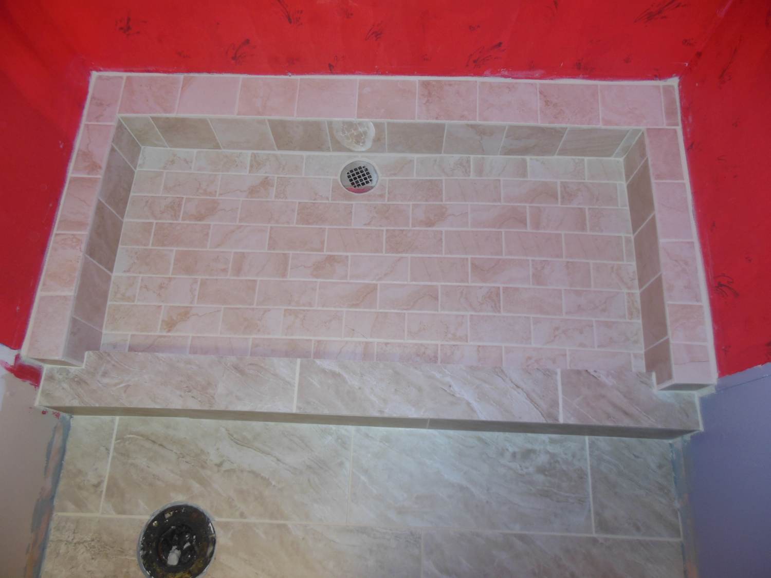 All tile is now not only set in mortar, but the grout lines are done as well. Look at those beautiful cuts around the toilet flange and the water lines.