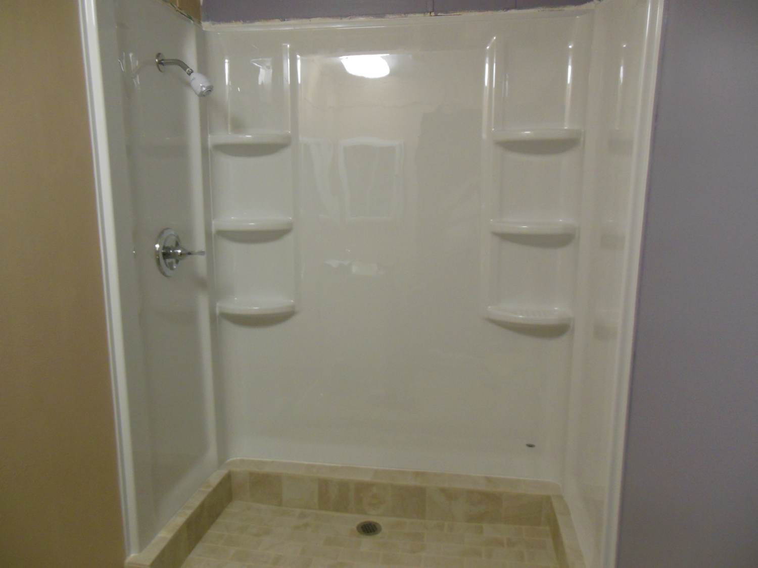 Braces are out, and this thing is glued in. Also, now the bottom is caulked, and the handle and shower head are in place.