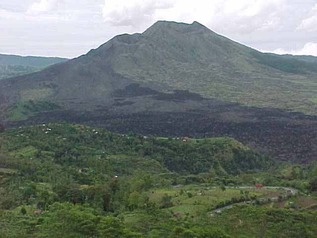 of smoke appear. Last eruption was in March of 1963. You can see three craters on the left and below them the black lava, which is now being crushed and made into building block. This whole scene is actually part of a much larger crater which includes Lake Batur, on the east side of the island. |