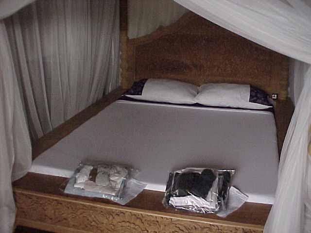 At the Guesthouse, all rooms have elaborately carved bed with a net.