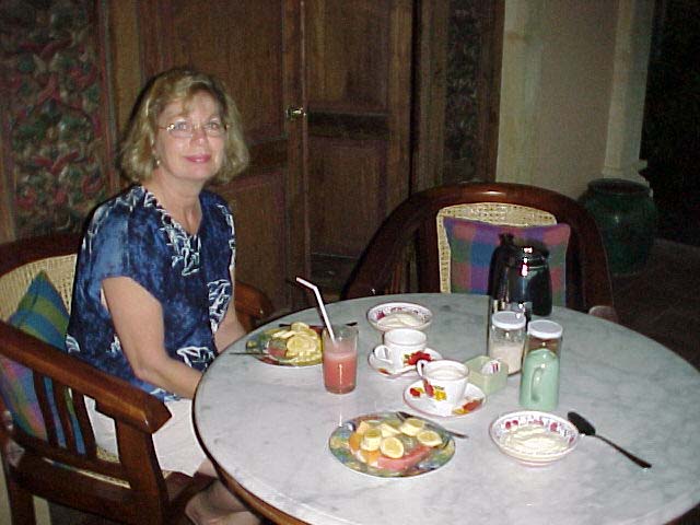 yogurt, followed by Banana crepes or croissants or eggs. Temperature does not vary more than about 8 degrees year round in Bali. Though there is a dryer season (June to September) when the humidity is slightly less. All of Bali is about the size of our sate of Delaware. There are some higher mountain areas where it is noticeably cooler. We survived the humidity in Ubud by taking several showers a day! |