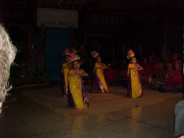 Nyoman's sisters were not prepared for us. Fortunately there was a performance by children of a variety of Balinese dances with Gamelan music made from gongs, drums,striking of metal keys, bamboo, flute and two string zither. The players are not professionals! There is no written music. It's played from memory and in perfect timing! (sorry for the poor night photo) |