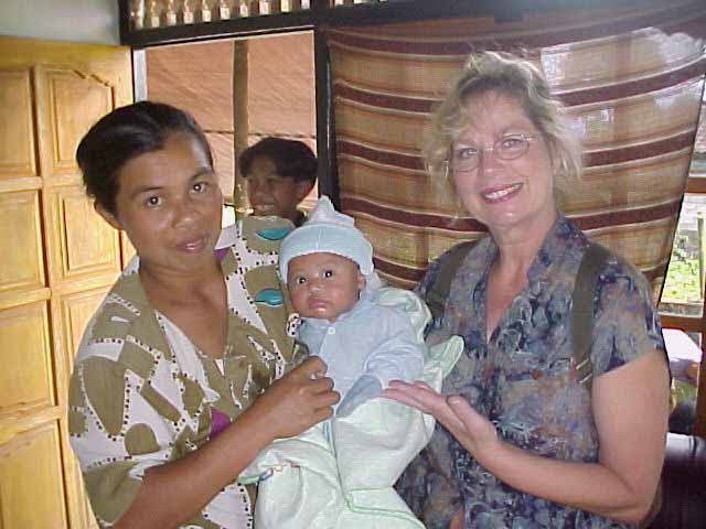 calendar) in Nyoman's village. We sat on the floor in our sarongs, drank Bali coffee and ate small sweets and were introduced to the relatives of the baby. Here Jaunita poses with the mom and baby. This is a big event and most of the villagers were there! |