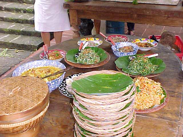 and eat. Rice in the basket. Banana leaf covered plates and the nine