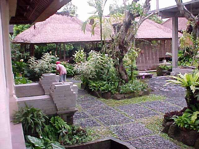 area in the background. Sweeping up leaves is a daily task for Balinese.