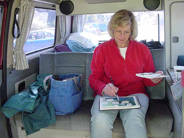 lunch in the VW Westfalia. It was hard to get her to quit painting and eat!