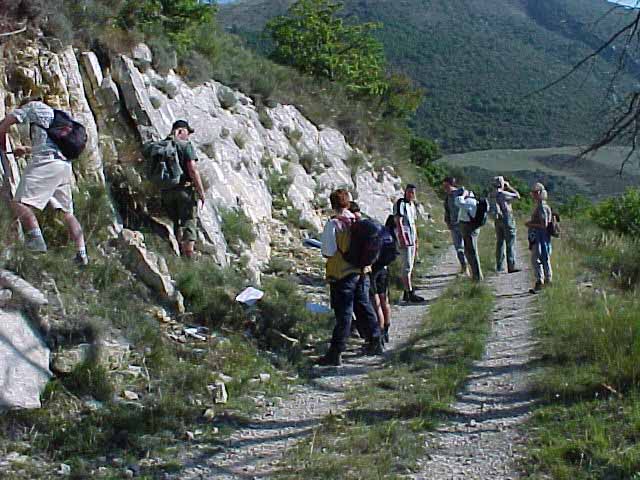 Jaunita in borrowed hiking boots on the far right! We were fortunate to meet two Micro Paleontologist professors from Univ.of Tubingen, Germany, who also spoke quite good English. They invited us to spend the day with their class of 10 students, solving a goelogic puzzle. The up tilted layers are 130 million years old here and it's possible to walk thru 30 million years of geologic layers in a few hours! |