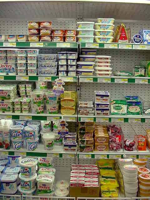 dairy case is twice the size of American ones, with many kinds of yogurt,