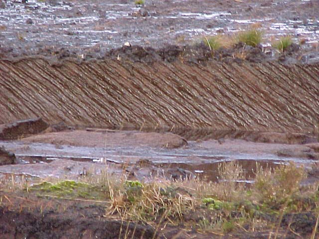 of building up. Here is harvested by machine but in many places is still dug by hand, dried and burned for heat and cooking. Has a nice sweet smell when burning. Is still used all over Ireland. There is now a commercial form of peat which is compressed into "bricks", is sold at most gas stations and reminds me of "Presto Logs." |