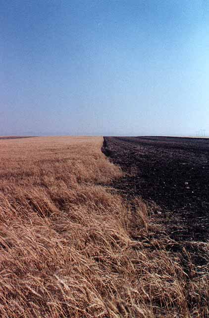 earlier. Next year, the wheat will be planted on the strip to the right, and the strip to the left will lie fallow. Also, planting is done so that the prevailing winds blow across the strips, rather than the length of them. That prevents soil loss due to wind erosion. |